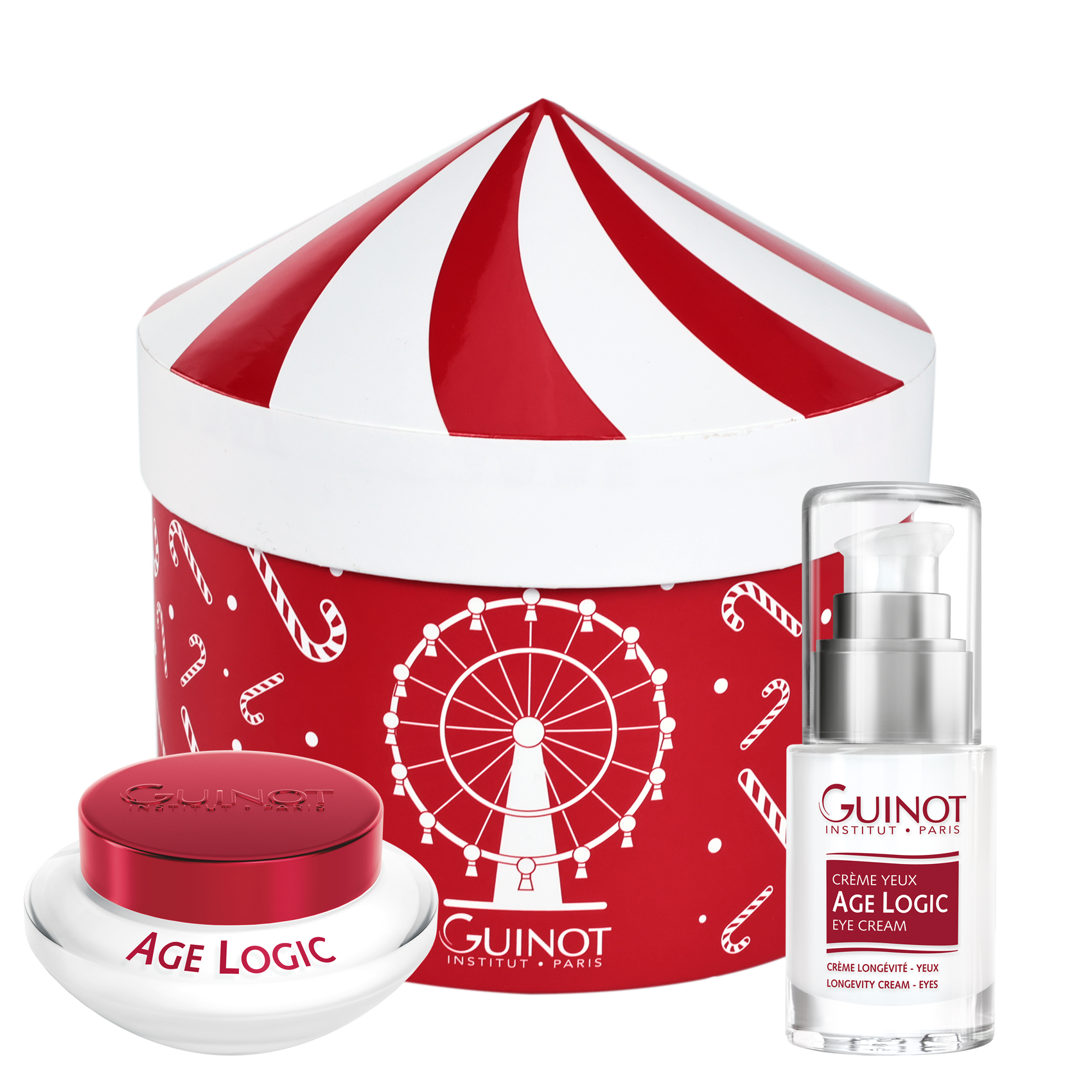 Compuesto por 2 productos para el cuidado de la piel Guinot presentado en una caja con un diseño navideño que evoca a una feria antigua.
