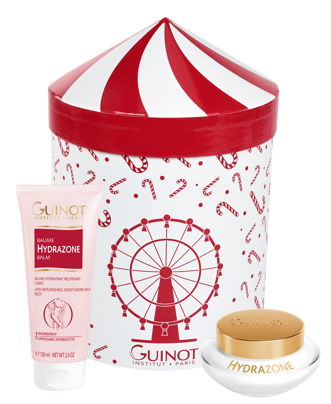 Compuesto por 2 productos para el cuidado de la piel Guinot presentado en una caja con un diseño navideño que evoca a una feria antigua.