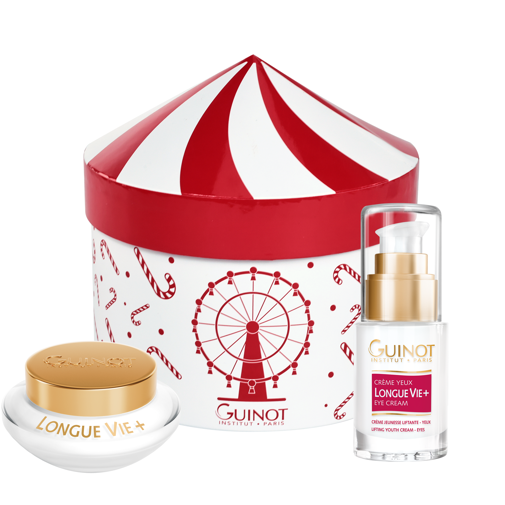 Compuesto por 2 productos para el cuidado de la piel Guinot presentado en una caja con un diseño navideño que evoca a una feria antigua.